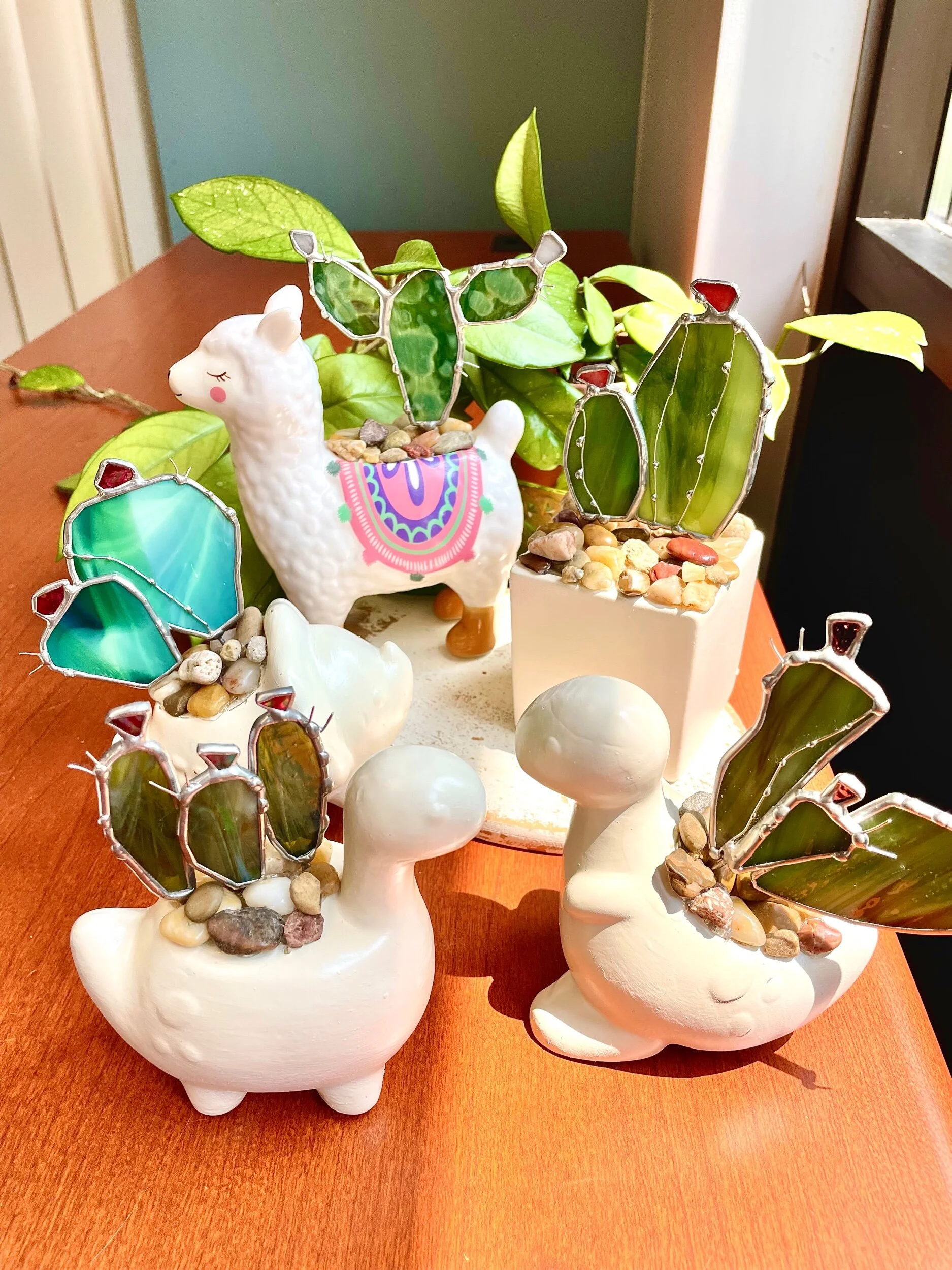 The Skltns ("bones" of items being reused) are thrifted or gifted glass and old Dino Pots. The cacti’s are removable if preferred!