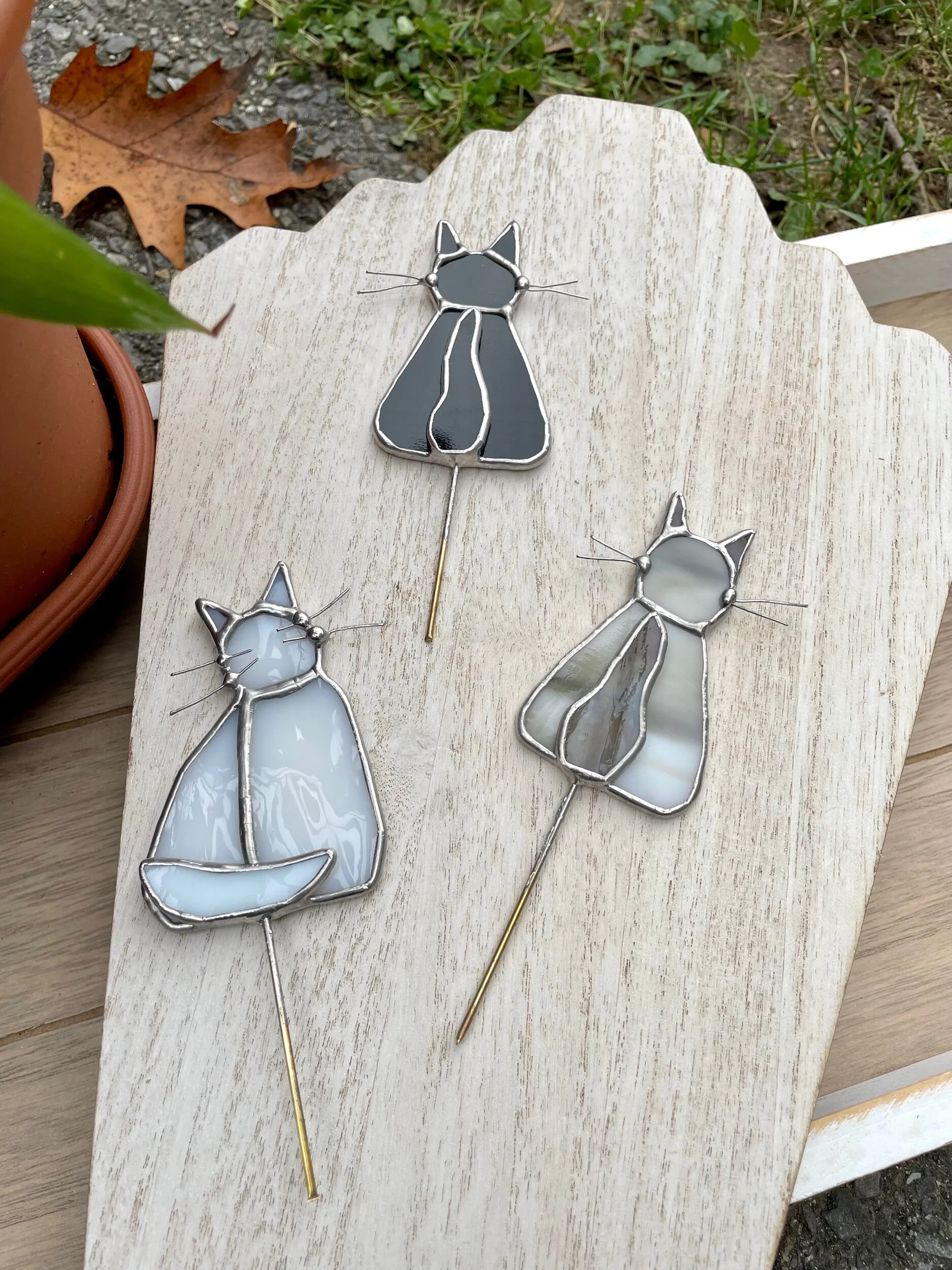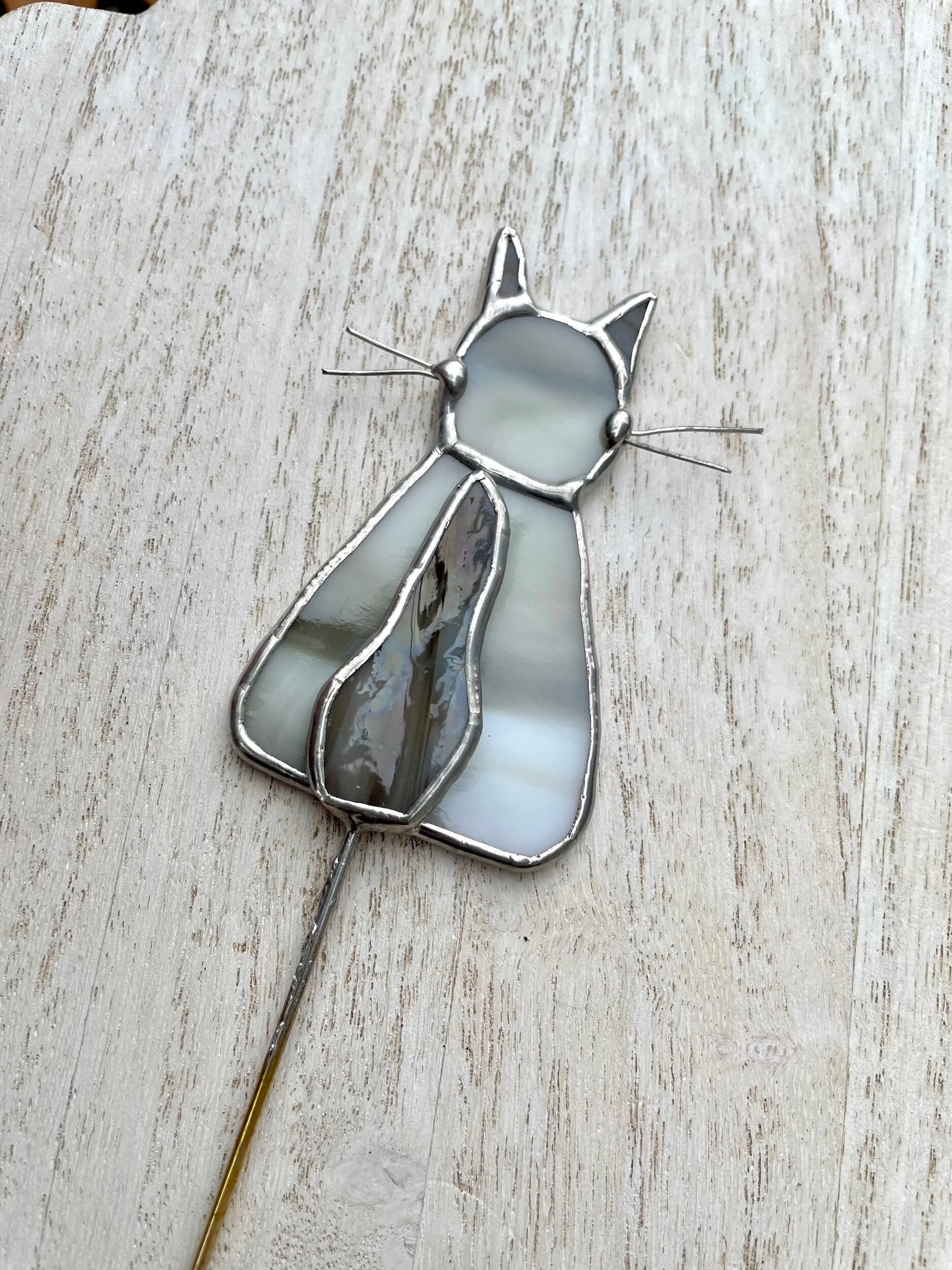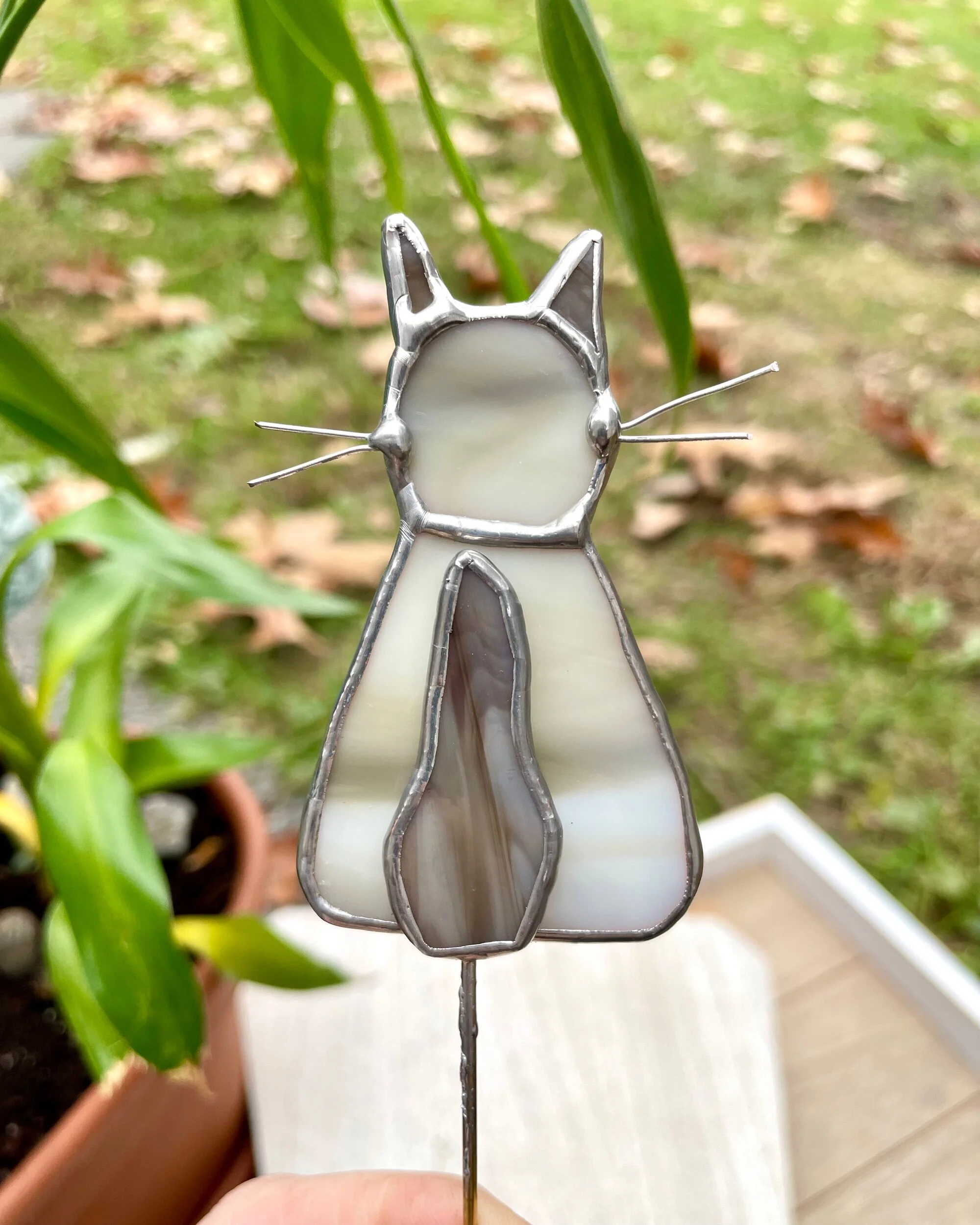 One of a kind stained glass Planter. This cute cat has a pole attached at the bottom to be put in any of your plants that need a little more color. Each glass piece is made differently with different colors, textures and patterns. So none are alike! 💛