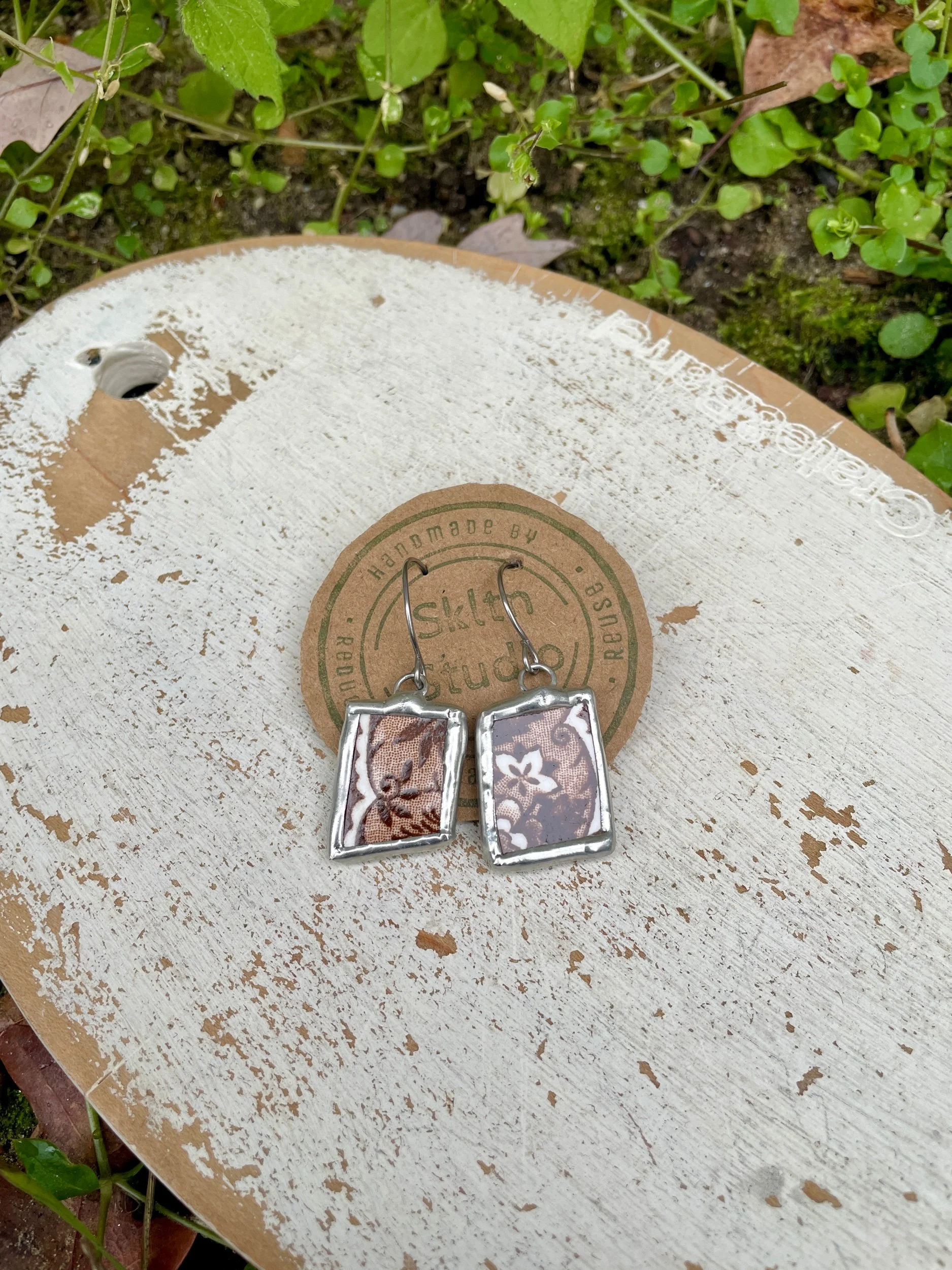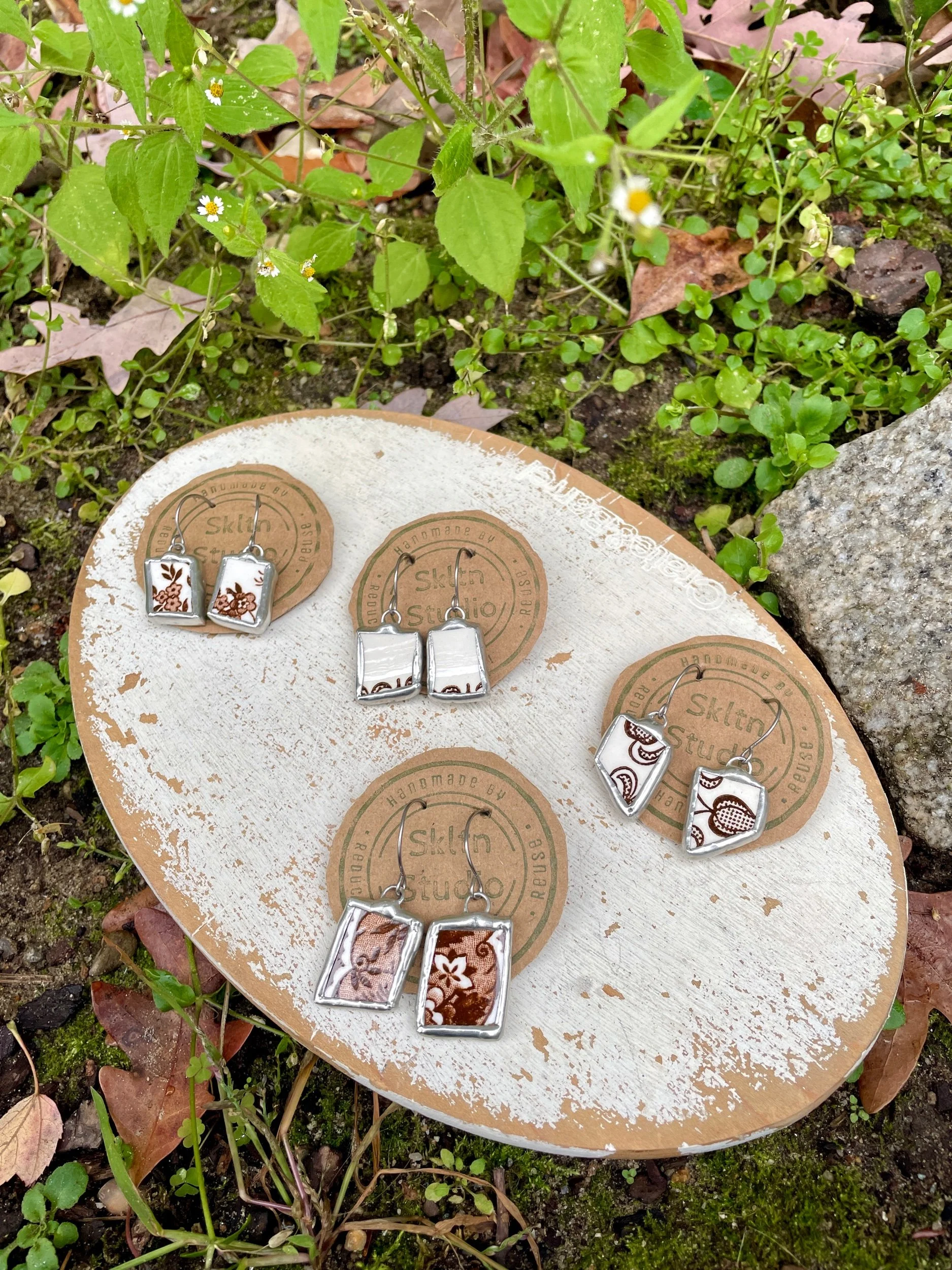 One of a kind earrings made differently with a variety colors, textures and patterns from old ceramic plates. So none are alike! I have more pieces of the ceramic if you want a different size or shape.💛